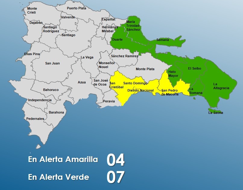 Santo Domingo, República Dominicana.– El Centro de Operaciones de Emergencias (COE) informó la ampliación del nivel de alerta para 11 provincias del país, debido a las condiciones meteorológicas asociadas a una vaguada y la incidencia de un sistema frontal que mantienen inestabilidad y alto contenido de humedad sobre gran parte del territorio nacional.