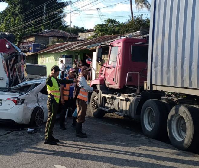 Un aparatoso accidente múltiple se registró en la Autopista Duarte, específicamente en el tramo de El Pino, luego de que el conductor de un camión realizara una maniobra en reversa sin percatarse de los vehículos que transitaban por la vía, provocando una reacción en cadena.